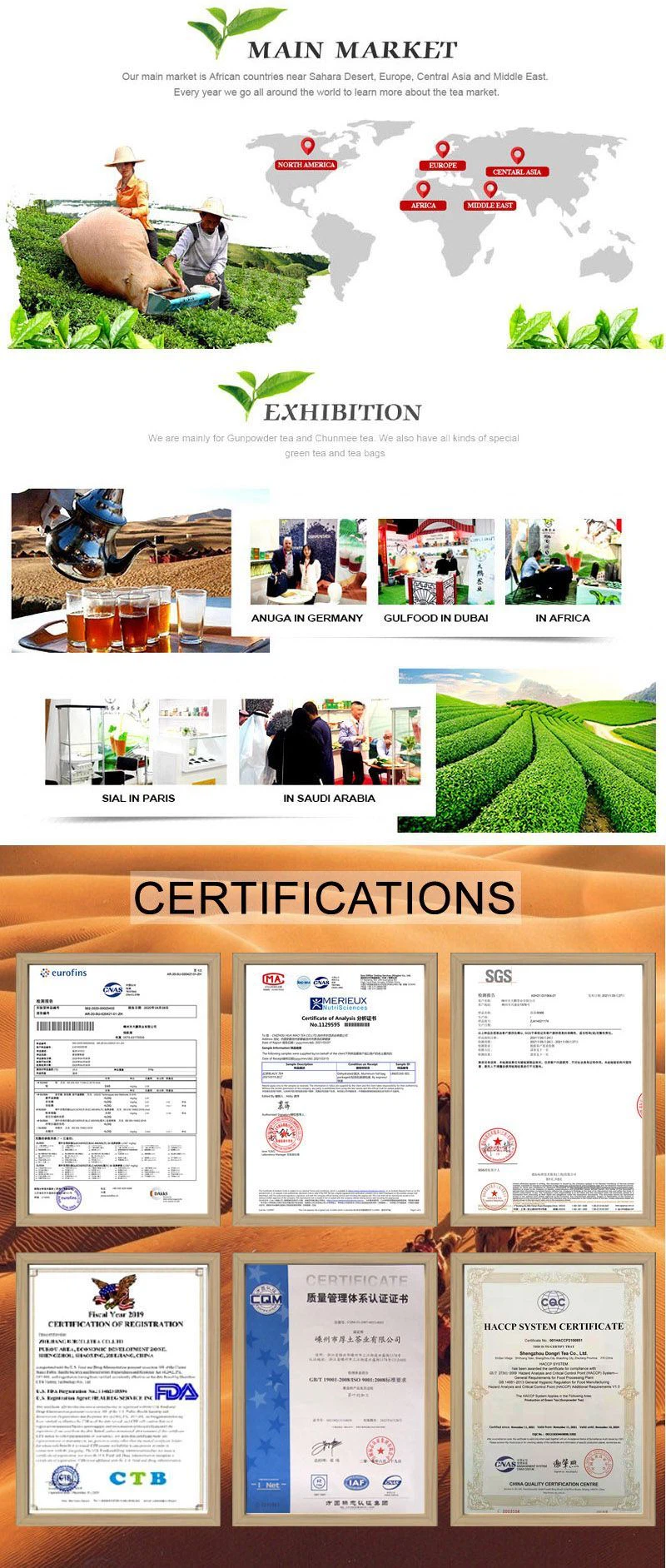 Aðalvaran er Chunmee te og Gunpowder te. Við flytjum aðeins út te meira en 20.000 tonn á ári, heildarmagnið eykst ár frá ári.